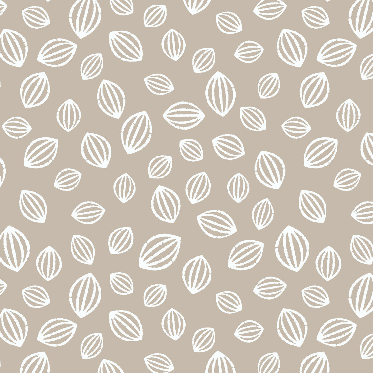 White pods cascade across the canvas. Some almonds huddle in cozy clusters while others twirl off on solo adventures, creating a rhythm that’s both organic and playful.