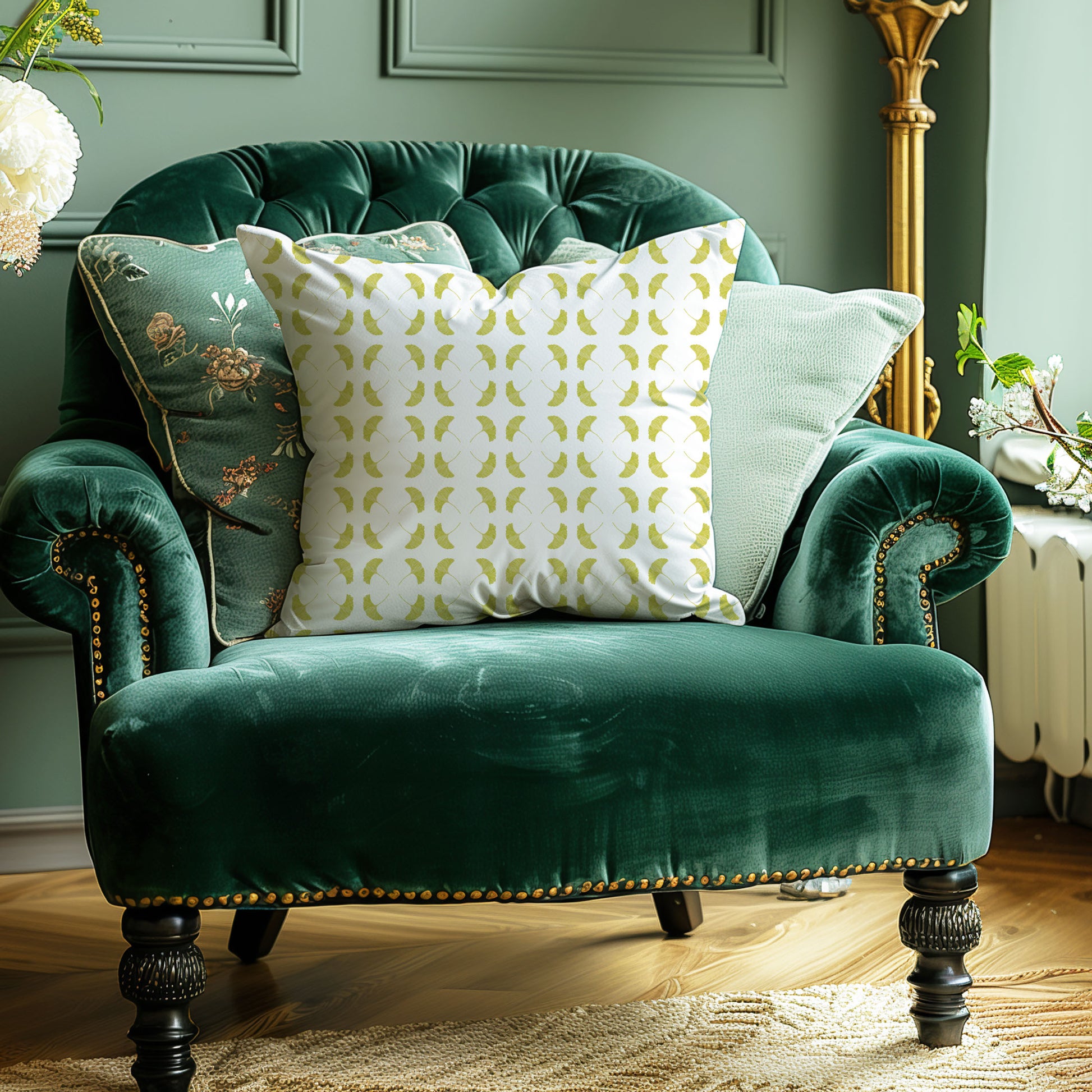 Ginkgo leaves groove in a symmetrical square-dance, their chartreuse fans arranged like butterflies caught mid-flutter. Against a pure white canvas, these vibrant green forms echo one another in elegant repetition, evoking ancient gardens stirred by a gentle breeze.